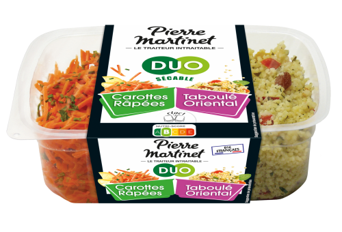 Taboulé oriental 50% : semoule de blé 56%, légumes (poivrons, tomates, oignons), jus de citron, huile d'olive vierge extra, huile de colza, raisins secs, menthe, épices