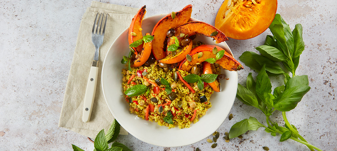 Dans un saladier ou dans une assiette creuse, déposer la salade de Couscous Végétal Pierre Martinet et l'agrémenter avec des demi-quartiers de potimarron en essayant de donner du volume. Parsemer l'assiette ou le saladier avec une feuille de basilic et de la menthe fraîche.